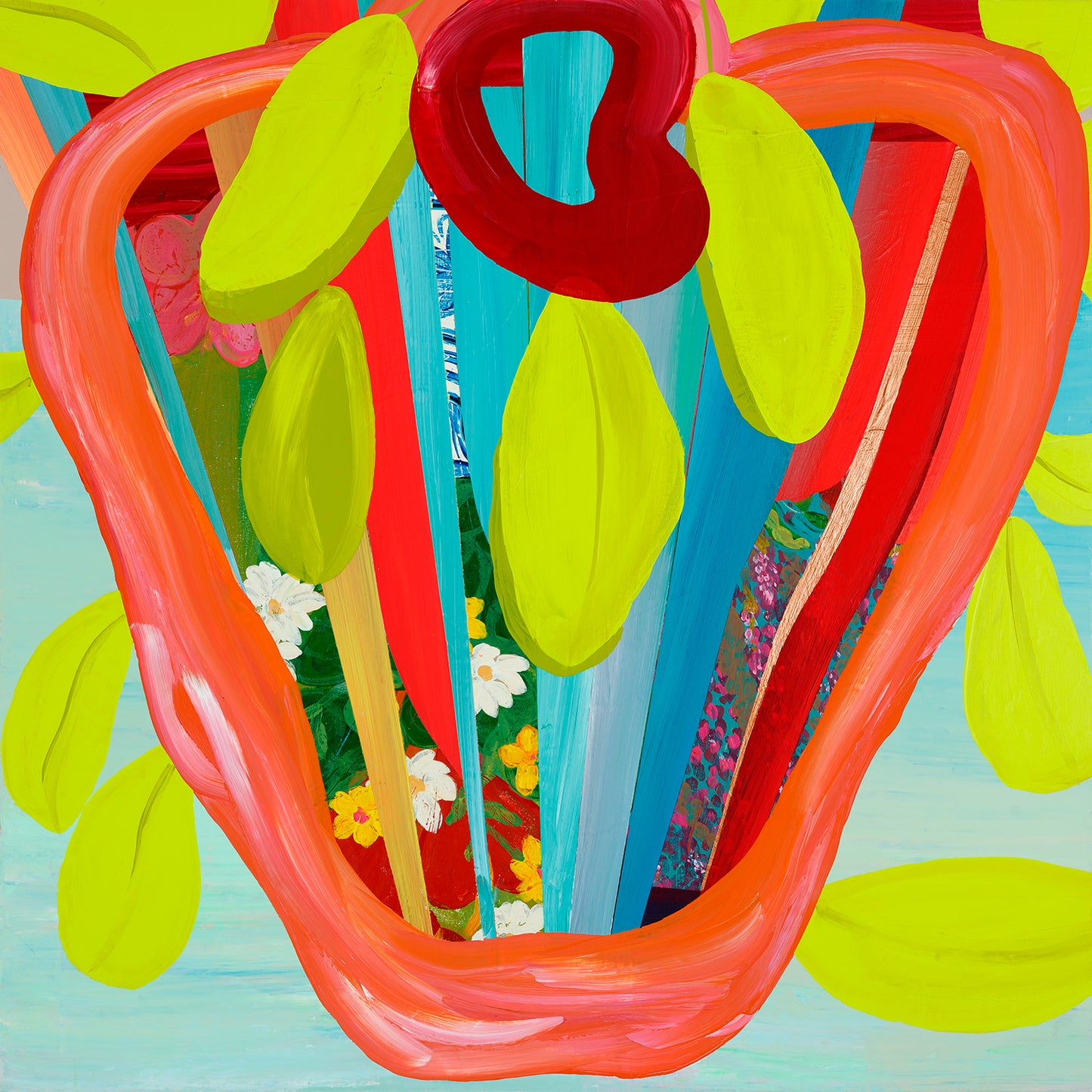 Obra abstrata colorida. A artista busca retratar a fauna e a flora do Brasil.