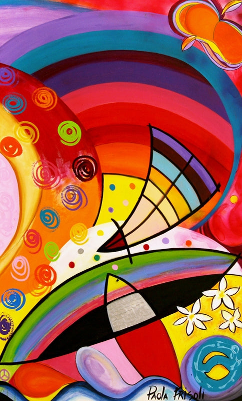 As telas de Paola Frisoli atraem, sobretudo, os amantes da decoração pelo seu harmonioso diálogo entre formas e cores. O alegre e quente traço da artista plástica revela universos oníricos de profunda intensidade. Tome-se como exemplo as obras "Universo Feminino, um Mundo Encantado" e "A Mulher no Jardim II".
