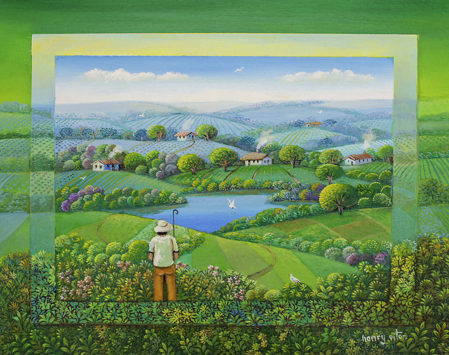 Suas obras têm como referência as memórias da infância no interior, inspirando alegria e tranquilidade no observador, que é transportado para um lugar de paz.