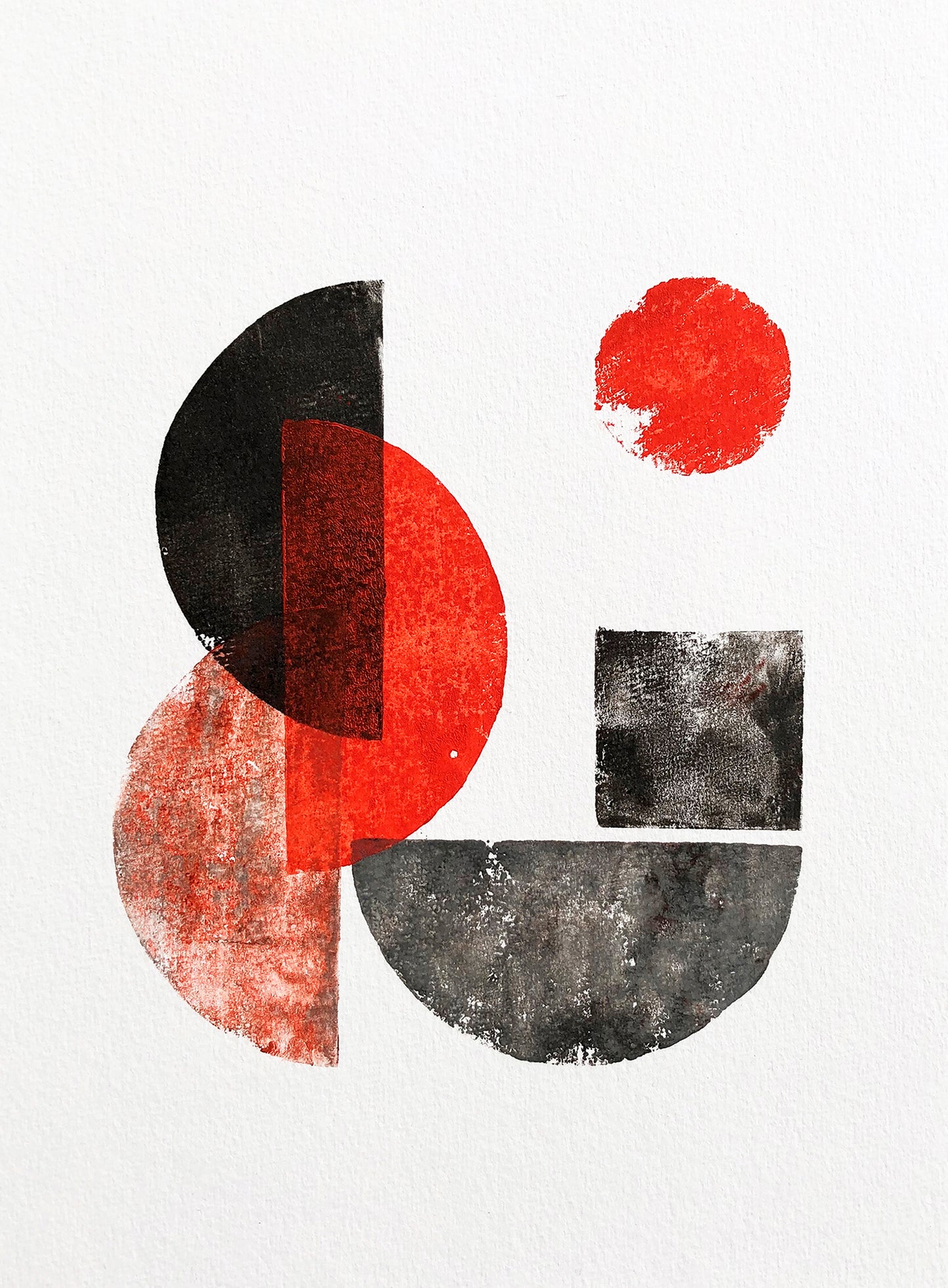 Pintura à óleo. Composição de formas geométricas. Preto e Vermelho.