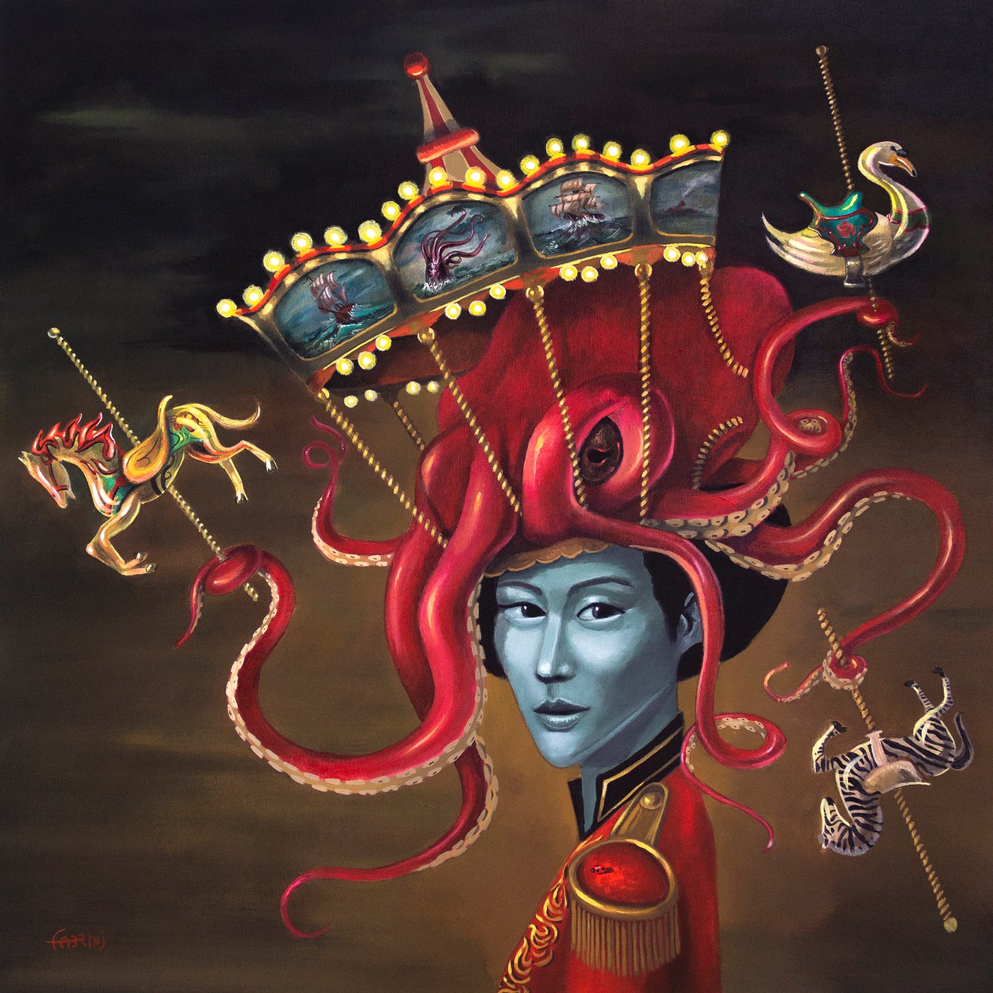 Pintura em acrílica. Surrealismo. Colorido. Vermelho. Circo.
