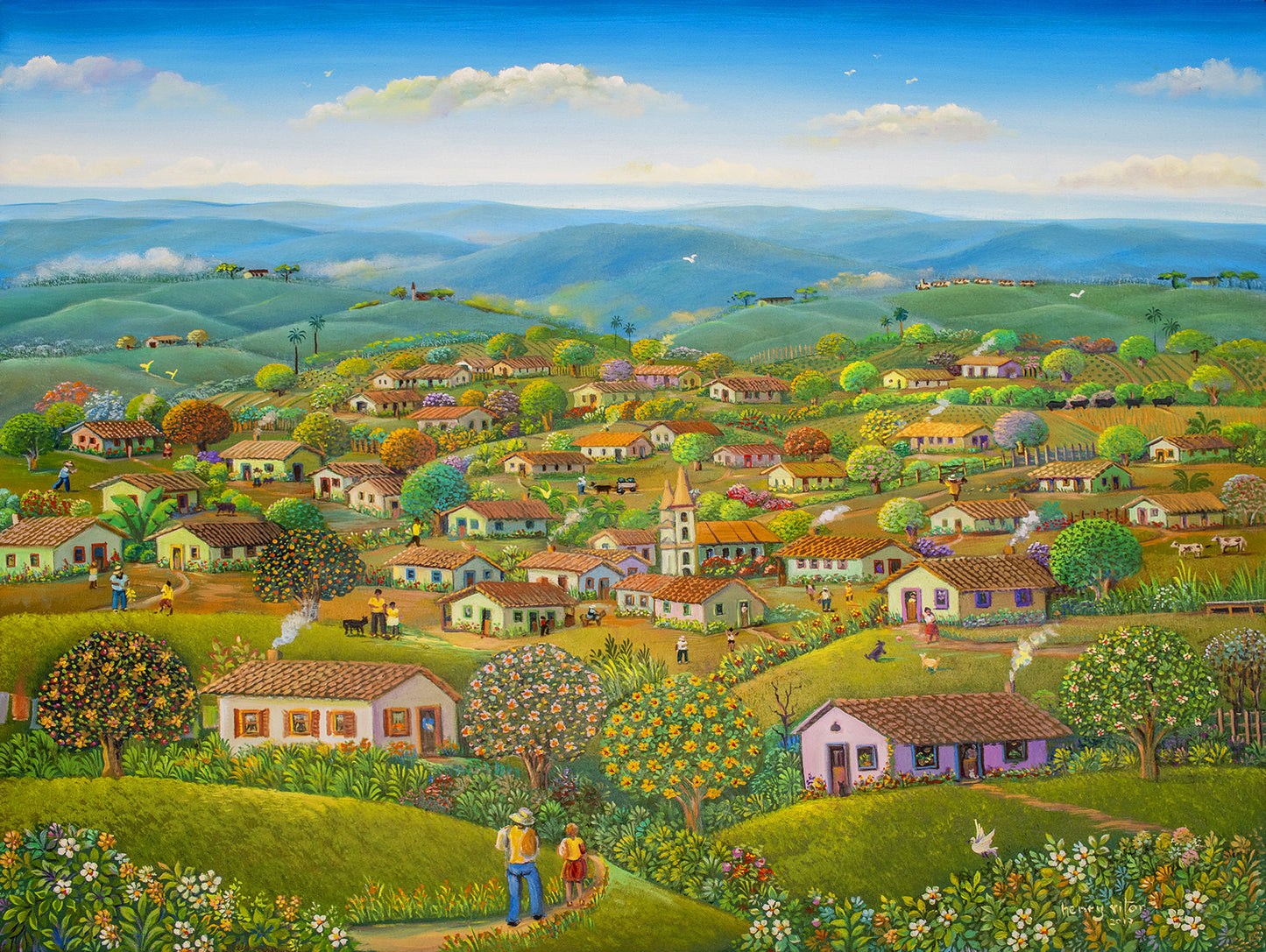 Suas obras têm como referência as memórias da infância no interior, inspirando alegria e tranquilidade no observador, que é transportado para um lugar de paz.
