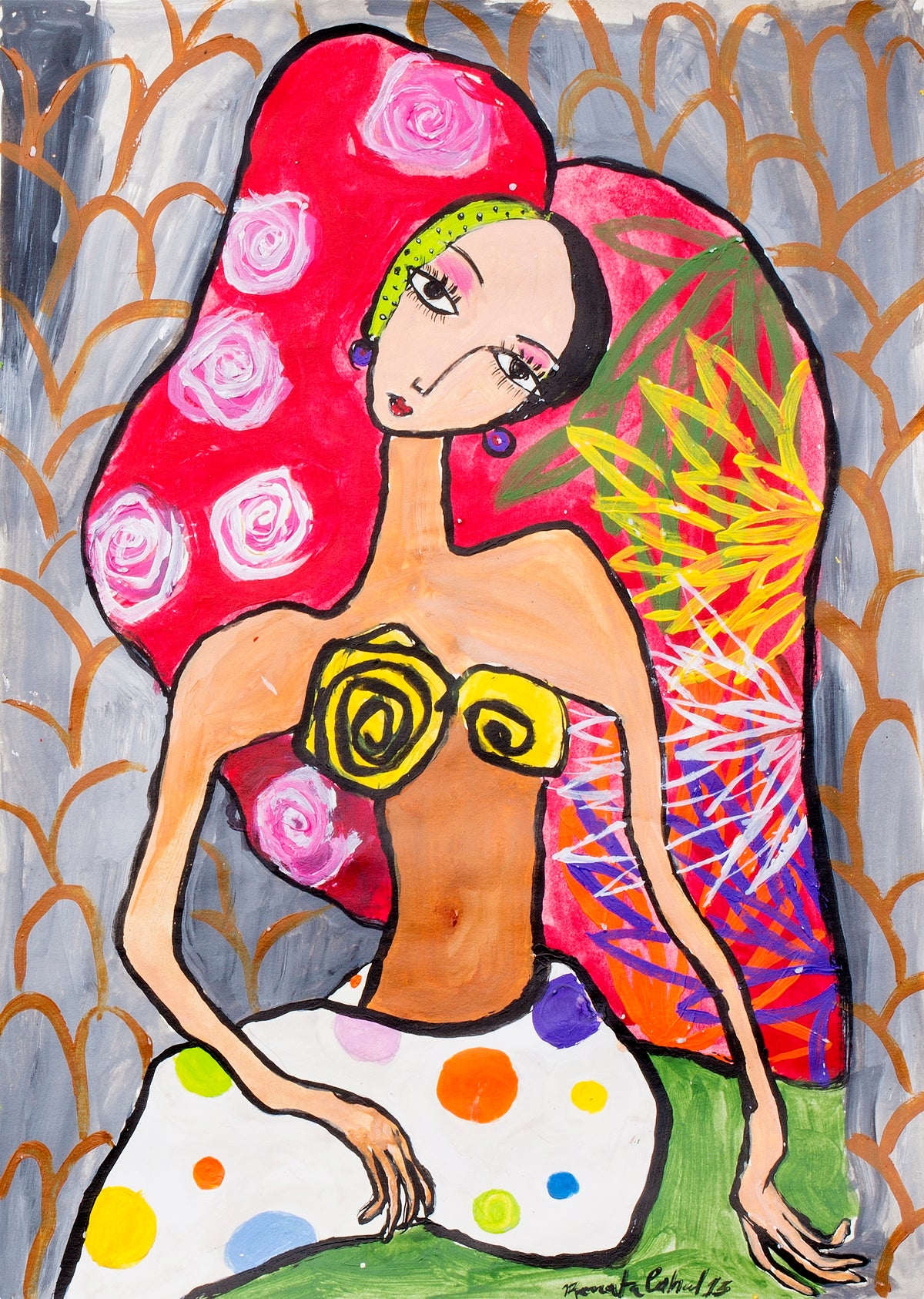 Paraibana, nascida em 1983, a cultura do Nordeste, as cores, o folclore e as belas paisagens sempre foram fonte de inspiração para o meu trabalho. Desde criança me encantam as formas que eu posso imaginar surgindo em uma folha em branco. Contornos, cores, sobreposições me fazem mergulhar em um universo de criação que expressa todo o sentimento que há em mim. Durante a minha infância eu costumava passar horas com papel e lápis, desenhando objetos pessoais, retratando familiares sem que eles percebessem. As formas femininas eram as minhas favoritas. Cresci, e desenvolvi o prazer artístico através da pintura em tela, retratando amigos e meus três filhos, portraits que resultaram na minha primeira exposição individual, em 2012. Após essa fase, a busca por uma maior liberdade e coragem para o meu trabalho me fez mergulhar na criação das minhas madonas neo-expressionistas. Os traços rebuscados, contorcidos, e ao mesmo tempo sensuais e elegantes, cores vibrantes e olhares comoventes, são as características marcantes da minha obra. Os títulos dos trabalhos também sugerem que tipo de sensações surgiram no momento da criação: desejos, reações e até sofrimento. Enfim, um trabalho de expressão e liberdade.